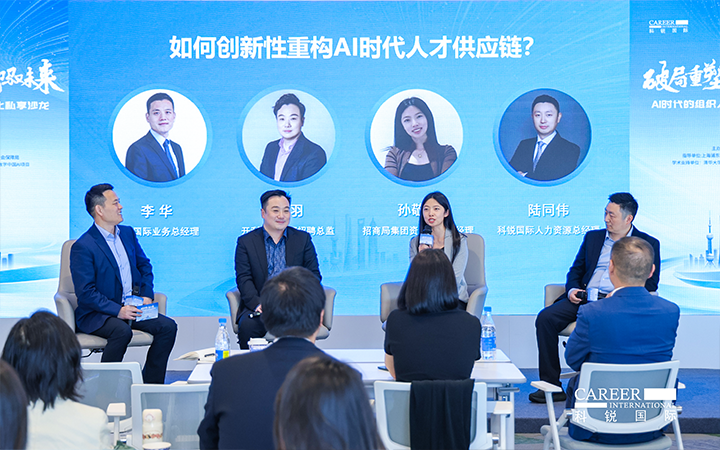 圆桌讨论环节,由凯发k8官网国际业务总经理李华主持,开利亚太总部招聘总监邹羽、招商局集团资深AI产品经理孙敬萍、凯发k8官网国际人力资源总经理陆同伟三位专家,分别从外资、央国企和民企视角,围绕AI时代人才供应链创新性重构话题展开深度对话。