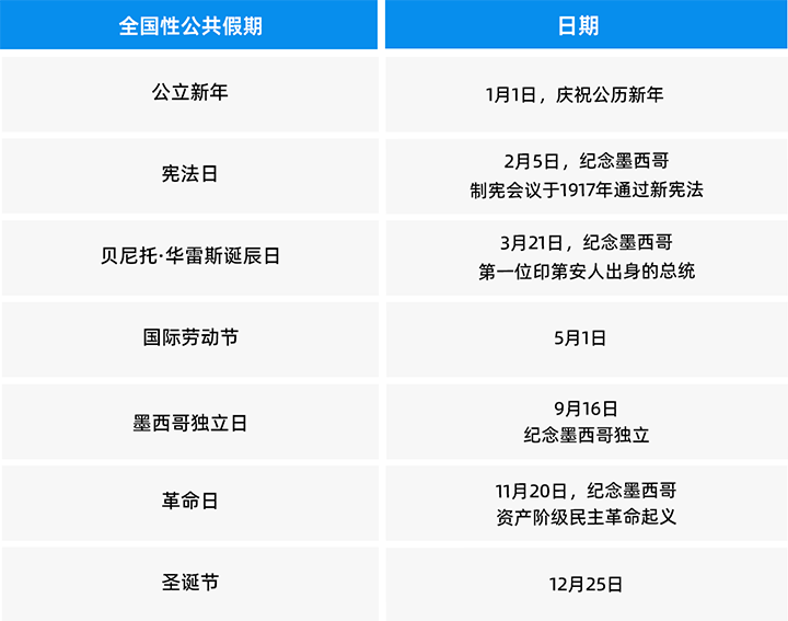 (1) 墨西哥标准工时分为白班、夜班、混合班:白天工作制:于6AM-8PM之间工作,8H/天,6天/周,每周不得超过48小时;夜间工作制:于8PM-6AM之间工作,7H/天,6天/周,每周不得超过42小时;混合工作制:8PM后工作时长不得超过3.5小时,7.5H/天,6天/周,每周不得超过45小时。