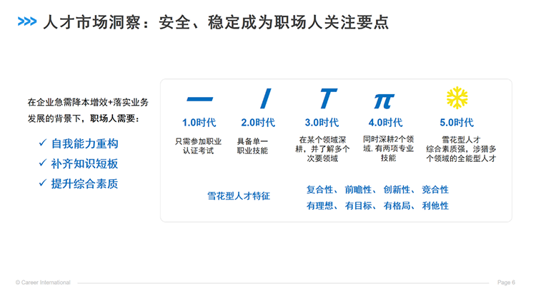 基于公司业务一线实践,我们看到企业对于人才需求总量有所减少,但对于核心技术人才、复合型人才、精细化运营人才、商业变现人才等依然求贤若渴。此外,企业对于人才的要求也更高了。在经济上升期时,企业急于扩展业务,可能差不太多的人就用了,但现在是差一点可能就不要了。由于信息化、数字化浪潮,市场和业务都在快速迭代,企业希望人才视野能够更宽广,能够拥抱变化,快速适应新的环境,所以企业需要的是雪花型人才,即综合素质强,涉猎多个领域的全能型人才,既有能力,又有格局,又能抓住这个时代的机遇,适应新环境的要求,又能实实在在的变成经营成果和可复制的商业模式。