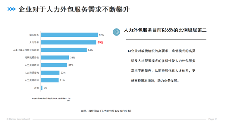 我们曾服务过通讯行业中的一家芯片客户,他们芯片生产用人都是我们招募和管理的。因为当时有很多不确定性,客户希望我们可以快速找到有专业技能的人,快速到岗后完成试生产,确认新的战略方向是否可执行。如果方向被证明是对的,客户可以从外包员工中挑选出核心人才转成正式员工继续使用;如果方向被证明不对,就可以将这些员工快速流转到我们同行业内其他客户处继续工作,规避了客户的品牌公众形象的负面影响。因为,在外面看来,企业似乎没有出现过大规模招人和减员的动作。所以,当企业的业务方向和战略不确定的时候,就可以使用外包来提升组织的敏捷度,实现业务的快速推进或者转向,这样的打法在我们的服务过程中还有很多很多。